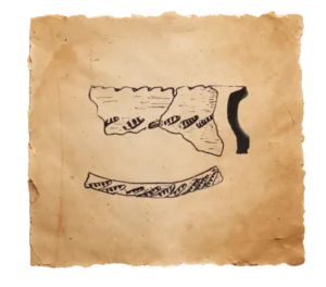Zabytek zachował się w postaci niewielkiego fragmentu górnej partii naczynia, obejmującego wylew oraz szyjkę. Krawędź wylewu zdobiona jest odciskami ukośnych kresek o wyraźnej, poprzecznej strukturze. Analogiczny motyw występuje bezpośrednio poniżej wylewu, tworząc spójną i rytmiczną kompozycję dekoracyjną charakterystyczną dla miejscowej tradycji garncarskiej. Forma i detal zdobienia nawiązują do ceramiki zachodniosłowiańskiego kręgu kulturowego.
