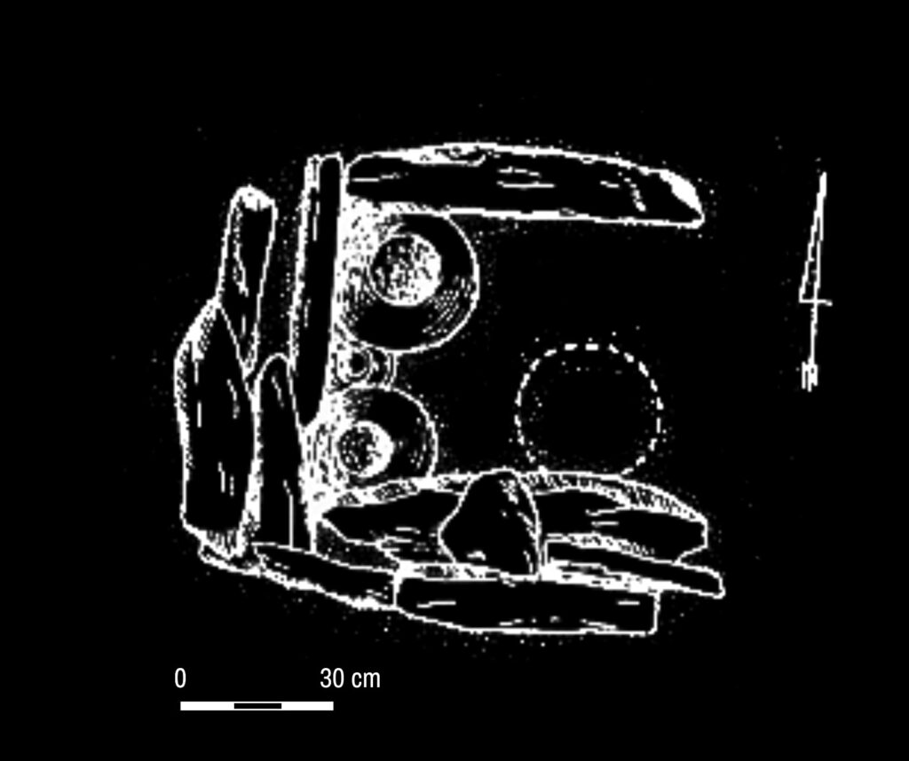 Ryc. 2: Plan grobowca z obstawą kamienną, zawierającego trzy popielnice twarzowe z grobu nr 2, stanowisko Rumia – Janowo, Markowice. Rysunek według: Fudziński, M. 2001.